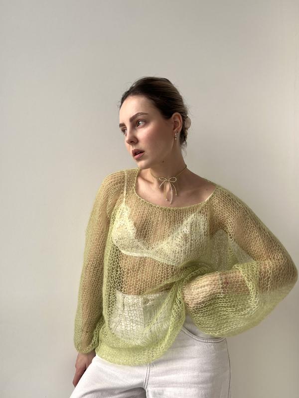 Павутинка в красивому фісташковому кольорі. Вільний силует, повітряна текстура, стане відмінним доповненням вашого образу. Склад: 75% мохер, 25% шовк.