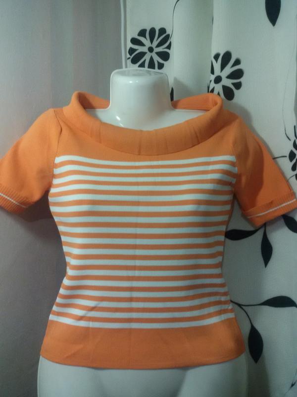 Состояние без замечаний. Цвет яркий оранжевый и белый. Вязка плотная и сильно тянется. Размер не указан. Замеры : Длина 48 см ПОГ 39-55+ см Низ 37-50 см Рукав 21 см Плечо 3 см