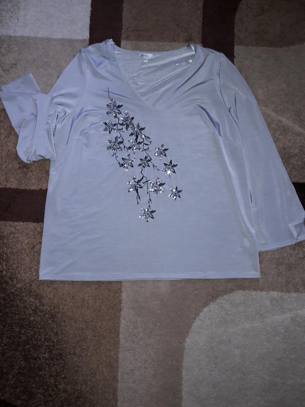 Красивая кофточка, спереди украшена цветами из паеток. Интересный пошив рукава. Хорошо тянется! Ткань микромасло(эластан). ПОГ- 64 см ПОТ- 63 см Длина по спинке- 67 см