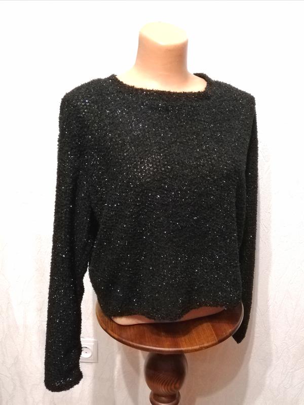 Гарний светр, джемпер з нитки "коротка травичка" великої рухомий в'язки з люрексом. Заміри: ПОГ - 58 см Довжина - 52 см Довжина рукава - 56 см Плече - 17 см Ширина манжета - 11 см Ширина низу - 50 см Довжина боки - 25 см