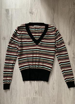 Фирменный . Хорошенький джемпер в разноцветную полоску . Приятного качества, 72 % вискоза , 28 % поломид . Размер подходит на М- Л , европейский указан 14 . Длина -55 см Хорошо растягивается Состояние отличное .