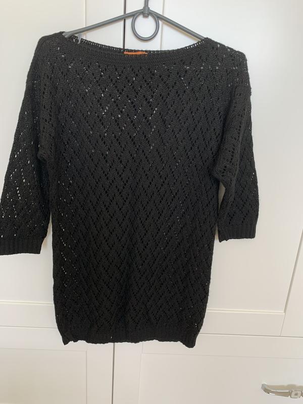Чорна подовжена кофта легкої вязки.Розмір 44-46.Стан відмінний.Не покошлачена, не покручена.