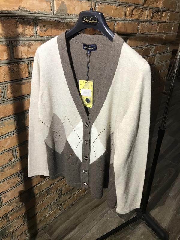 Кофта з натуральної вовни і кашкміру Красивих колірів: молочного шоколаду, капучино і беж. Luisa Spagnoli made in Italy 🇮🇹 . Орнамент виконаний класичним ромбом. Аплікація австрійськими кристалами кольору Амбра. Глибокий V образний виріз. Рукав відрізний. Перламутрові ґудзики. Всі гудзики і кристали на місці. Тонкий і теплий. Дуже романтичний і сучасний. Розміри: довжина рукава 60 см, ПОП 37 см ПОГ 54 см, довжина по спинці 61 см. Ширина низу 56 см
