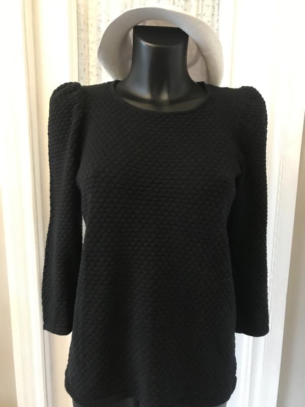 Стильный джемпером COS. Цвет-чёрный. Красивый крой:рукавчик-фонарик длиной 3/4. Красивая форма горловины. Об’емный рисунок, прямой крой. Просто, но со вкусом. Состав:хлопок -100/. Размер по бирке-М. Замеры:длина-60 см, ПОГ-47 см, ПОБ-48, рукав-3/4.