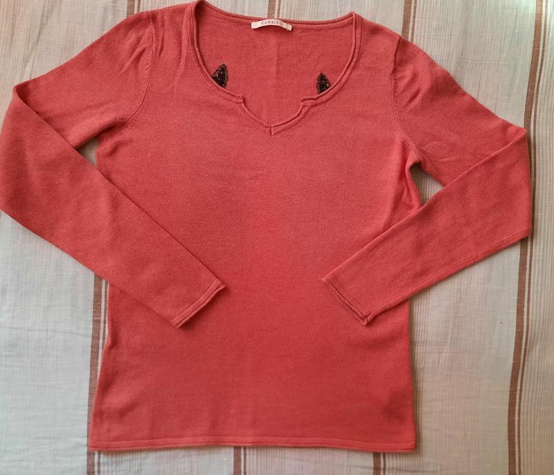 Оригинальный джемпер в отличном состоянии. Насыщенный коралловый цвет(фото 1.2) По краям всего изделия(а так же в вышивке на спинке) люрексовая нить ПОГ-44 Длина по спинке-59 Длина рукава-60