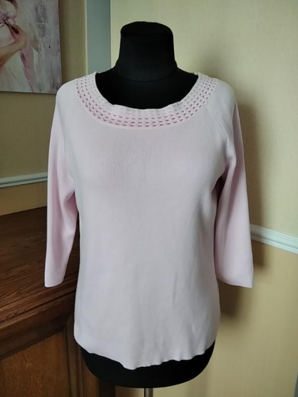 (Кф058) Вязанная кофта с вырезом и рукавом 3/4 . Цвет нежно-розовый. Бирка с составом и размером отсутствует. Носила на размером. 12/14. Замеры: плечо с рукавом - 50 см., ПОГ 51 - 60 см., ПОТ 46 - 58 см., ПО по низу 50 - 67 см., длина - 58 см. Состав не указан. Обмена и возврата нет. С удовольствием отвечу на все вопросы и вышлю дополнительное фото до совершения покупки.