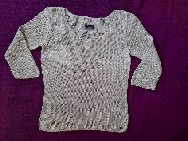 Цвет светло-серый. Рукав 3/4 -49 Длина по спинке-57 ПОГ-45 Состав-лён Указан размер L-по факту M Из нюансов: затяжка сзади на левом боку(последние фото)