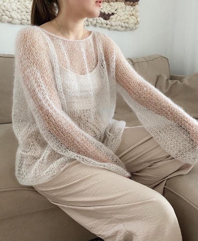 Воздушный, нежный и легкий свитер-паутинка. Состав : кид мохер/шелк. Его можно носить со спущенными плечами, с платьем и под джинсы. Универсальная и комфортная вещь на любой сезон.