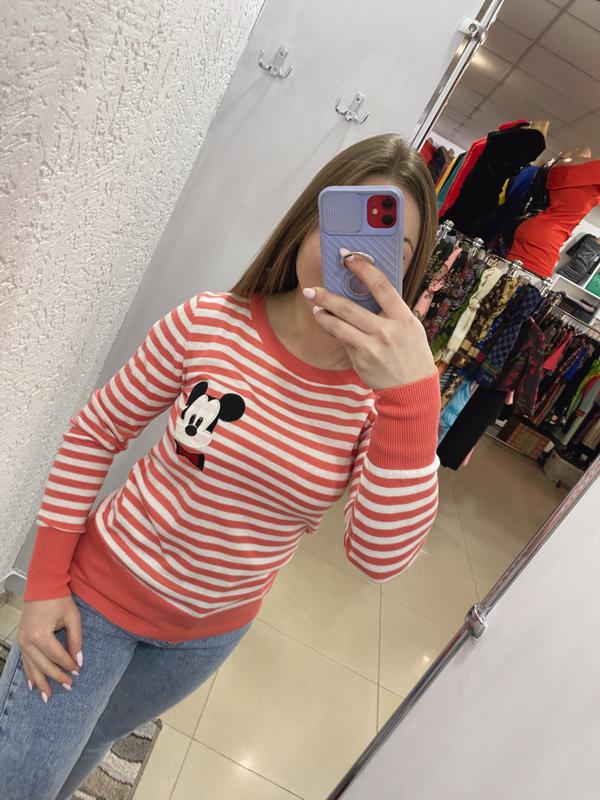 Яркий , красивый джемпер из тонкой вязки в кораллово-белую полосочку . С Микки . Классная вещь на осень .