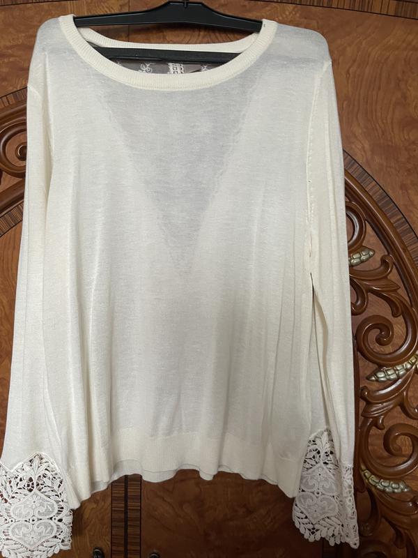 Тоненька вишукана кофтинка,мереживо на спинці і рукав .Розмір 48-50 .Стан-нової речі,тільки без бірки. Рекомендую👍 Ног-52/62см Резинка знизу-45/55см/напівобхват/ Довж-60см Плечі-41 Рукав-62 Колір-айворі Без дефектів