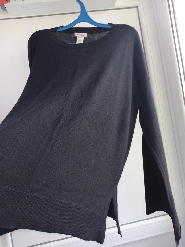 джемпер чёрного цвета тонкая шерсть,модал,нейлон,акрилик( состав) размер М по бокам разрезы рукава расклешенные к низу и тоже с разрезами