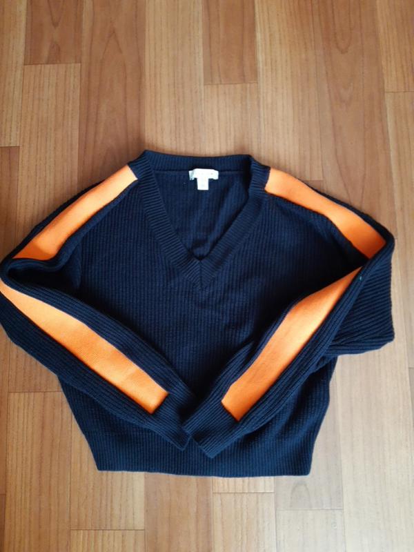 Оригинальный, современный свитер с треугольным вырезом темно-синего цвета фирмы Topshop. Отличное состояние и качество (акрил, полиамид, кашемир). На рукавах ярко оранжевые вставки, свитер свободного кроя, длина 49 см., расстояние между подмышками 57 см. Рукав заниженный, длина рукава от горловины 68,5