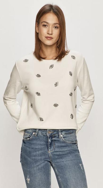 - Прямой фасон. - Длинный рукав. - Круглый вырез. - Тонкий, эластичный трикотаж. - Модель с аппликацией. - Отделка в виде стяжки. - Длина рукава: 58 см. - Длина: 61 см. - Ширина подмышками: 54 см. - Параметры указаны для размера: S. Состав: Основной материал: 60% Хлопок, 40% Полиэстер Резинка: 57% Хлопок, 38% Полиэстер, 5% Спандекс