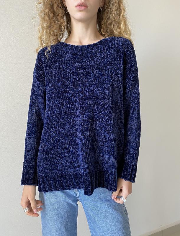 Синий велюровый свитер Размер М/Л (больше Л, но на М тоже хорошо сидит 🙌🏻) 100% полиэстер Ширина по плечам - 58 см Рукав приспущен ПО груди - 58 см ПО талии - 55 см Длина рукава - 47 см Длина изделия - 65 см Состояние 9/10 Очень приятный и мягкий ☺️