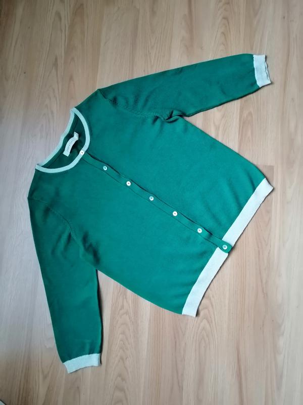 Милая изумрудная кофточка, НЕ секонд, в светлых вставках лёгкая золотистая нить, пуговки натуральный перламутр (ракушка), благородная, нарядная, цвет фото 3 и 4. Длина по средине спинки 52 см, плечи 34 см, отделка горловины 1 см, подмышки 46 см, низ 39 см, манжет 3 см, рукав 44 см, манжет 3 см, планка спереди 2 х 46 см.