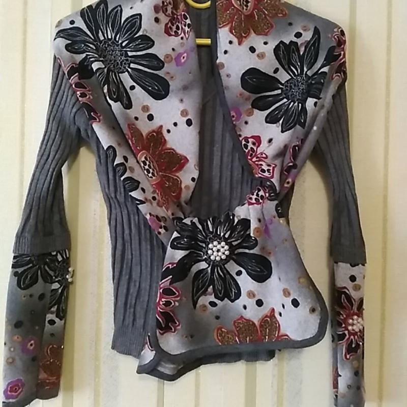 Рукава и шарф частично расшит бисером и бусинами. Шарф длина 150 см, ширина 24 см. Рукав 53 см, длина по спинке 50 см, пог 36 см, тянется до 45 см
