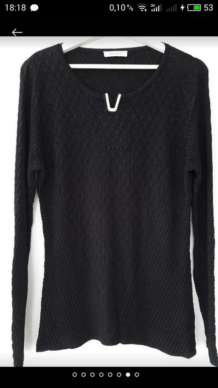 Стильный базовый джемпер в черном цвете, фактурной вязки, средней плотности,ближе к тонкой. Вырез красиво декорирован ,неглубокий вырез,прямой силуэт. Хорошо тянется. Ширина плеч-38 см Ширина в груди-90 см Ширина по низу-90 см Длина рукава -61 см Длина по спинке от плечевого шва-62