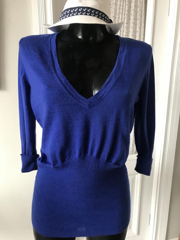 Очень элегантная и женственная кофточка из тонкой шерсти от Mart Visser. Красивый синий цвет, красивая модель, отличное состояние. Высокая резинка по талии выгодно подчеркивает достоинства фигуры, красивое декольте. Такжеиочень эффектно оформлена спинках рукав—до локтя с отворотом. Размер по бирке-42. Состав:шерсть-100/. Замеры:длина-69 см, ПОГ-46 см, ПОТ-31 см, рукав-3/4. Очень красивая и качественная.