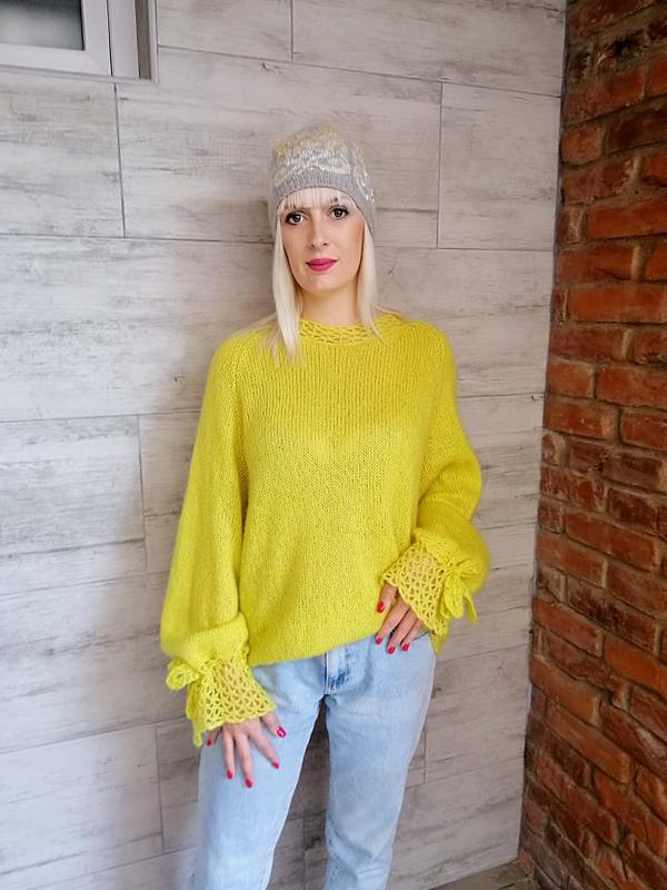 Нежнейший джемпер паутинка,связан из итальянского кид мохера с добалением люрекса.Воздушное кружево придаст вашему образу романтичности.Джемпер легкий как пух,мягкий и теплый.Размер оверсайз,с 44 по 52