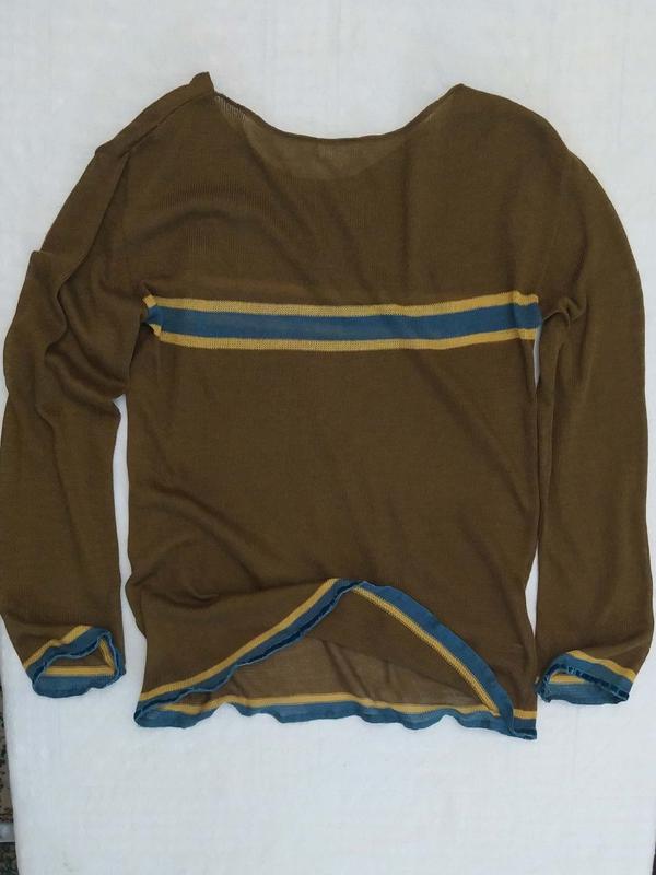 Свободный джемпер, трикотаж, отделан бархатной тесьмой внизу и на рукавах. Пог 49, пот 46, поб 49, длина 60, длина рукава 61, плечи 50. Бирка с составом срезана, материал на ощупь натуральный.