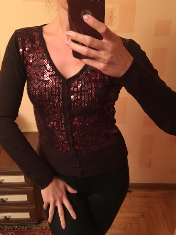 Нарядная кофточка в пайетках спереди (на спинке нет). Можно носить на тело или поверх майки, рубашки. Красивого шоколадного цвета. Размер 36/S. Идеальное состояние. Без дефектов! Есть запасная пуговица. Производство Турция.