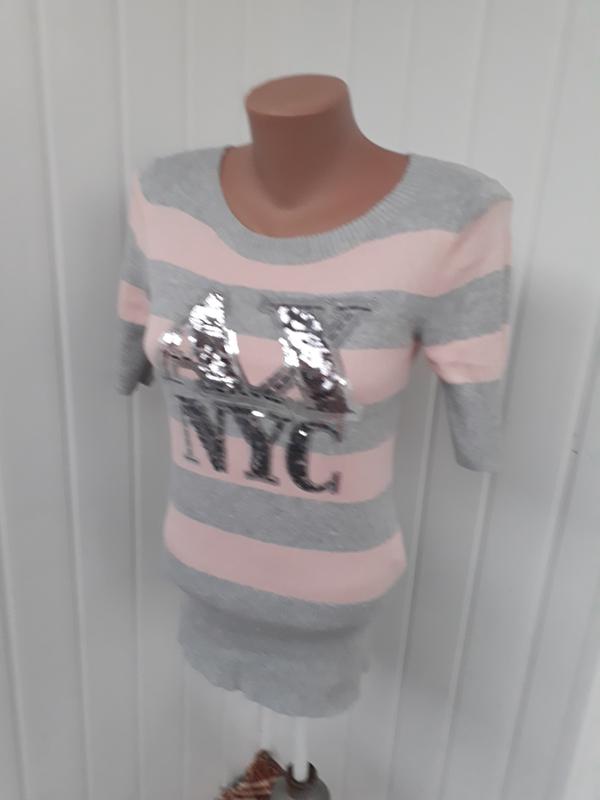 Трикотажная кофточка с короткими рукавами в очень хорошем состоянии. Плечи 34см, пог 40см, пот 37см, поб 33см (резинка), длина 63см, рукав от плечевого шва 26см. Замеры в спокойном нерастянутом состоянии. .3.10.