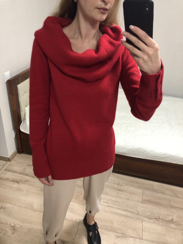 Мягенька кофтинка із шерсті, ангори і нейлону від англійського бренду Fenchurch. Колір не яскравий червоний. Розмір s. Комір можна обіграти по різному. Заміри: пог 45, ПОТ 42, рукав 62, довжина по спинці 65, плечі 36, висота хомуту 29
