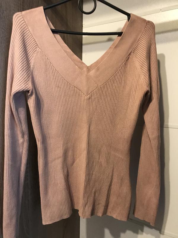 Пудро-розовая кофта в рубчик с декольте. Недостаток только один, его видно на фото