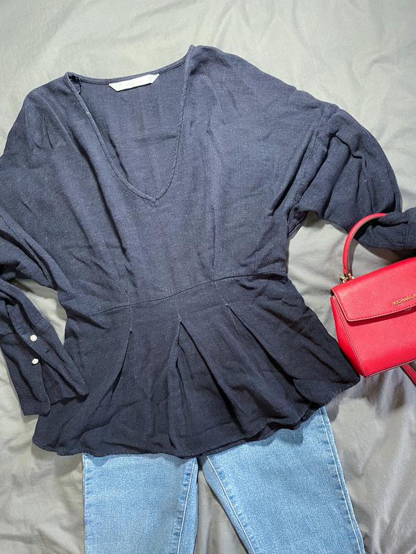 Трендовая кофта Zara темно синего цвета. Размер s. На талии резинка. Объемные рукава.