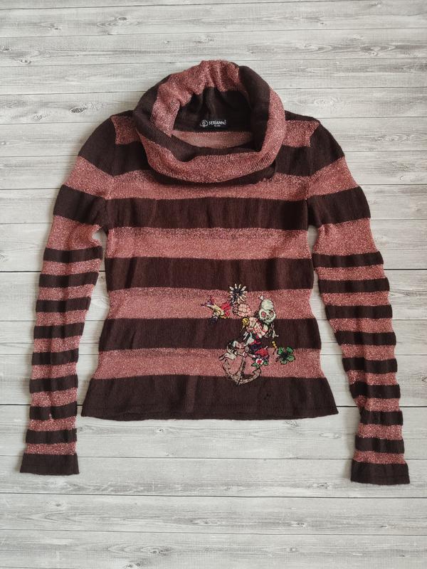 Облегченный свитер, размер S В полоску коричневая с красным золотом (с люрексом). Можно разбавить свой гардероб этим лёгким свитерком с горловинкой-хомутом. Длина: 53 см. Рукав (удлиненный): 64 см. Расстояние между плечами: 38 см. Пересылка по Украине.