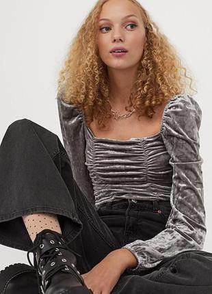 Топ з м'якого велюру з драпирующимся ліфом. Виріз горловини каре і довгі рукави. Вузька гумка на плечах і знизу на рукавах. Ліф на підкладці. Склад Бавовна 95%, Еластан 5% Розмір L Напівобхват грудей 40, дуже добре тягнеться в ширину і в довжину ( полномерный L) Рукав від горловини 69/49 Довжина изделия_47 Тканина приємна до тіла