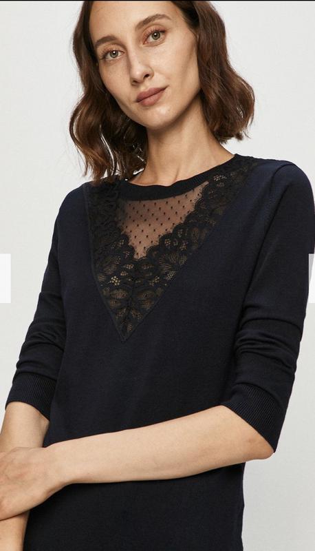 Модель с круглым вырезом выполнена из тонкого трикотажа темно синего цвета. - Прямой фасон. - Рукав три четверти. - Декоративные вставки. - Длина: 63 см. Состав: 20% Полиамид, 80% Вискоза