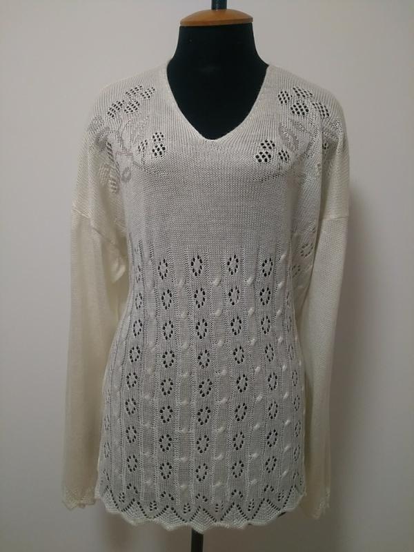 Ажурный джемперок жемчужного цвета. Бирок нет. Размер примерно L-XXL,точнее по замерам,возможен вариант оверсайз: длина 67 плечо-рукав 80 ПОГ 59 ПОТ 54 ПОБ низ 58 высота проймы 20 ПО рукава в локте 15 ПО рукава внизу 10,5 глубина выреза горловины спереди 13 высота разреза сбоку 9 см,разрезы по бокам. Состав: возможно хлопок/вискоза/акрил - лёгкая,воздушная и приятная к телу. Состояние:очень хорошее,но немного вытянулась. Можно носить заправив в юбку или джинсы,а можно на выпуск - кому как нравится. Высылаю после полной оплаты. Автоматические заказы принимаются только после полной оплаты. Смотрите и другие мои объявления - есть много интересного и по доступным ценам,щоденні розпродажі - календар розпродажів можна побачити в розділі "Про мене".
