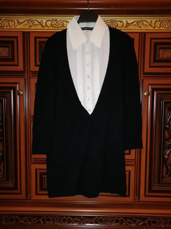 Батник чорний середньої щільності (віскоза, нейлон, спандекс), з глибоким вирізом і вставкою з білої сорочки (коттон, щільний). Стан дуже хороший, без дефектів. По боках маленькі катишки зовсім небагато, не видно. Пряма. Дуже струнким. Заміри: Довжина - Рукав 3/4 - 50 см Обхват грудей - 90-104 см Низ обхват - 90-104 см
