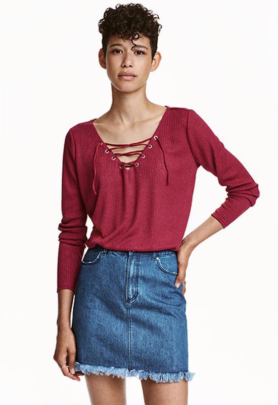 в'язаний джемпер від бренду H&M розм. М № ********** Мірки: плечі 36см, пог 47см, довжина 50см, рукав 60см Топ тонкої в'язки з рукавами довжиною три чверті. На топі трикутний виріз горловини зі шнурівкою. Колір: темно-червоний Склад: 70% віскоза, 30% поліестер Вигляд товару: з бірками