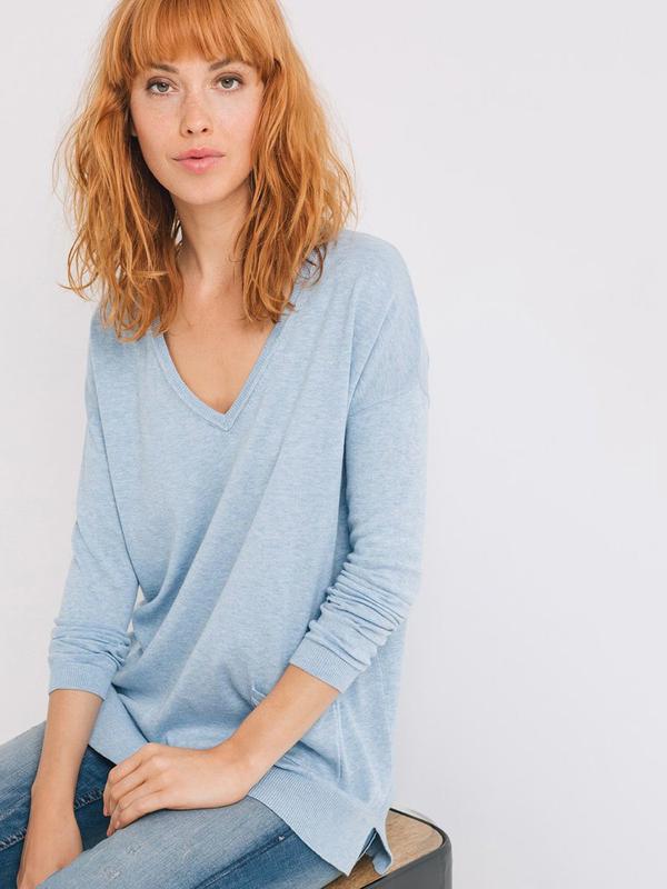 Пуловер прямого силуэта из качественного трикотажа. Изделие с длинным рукавом и V-образной горловиной. Модель дополнена практичным накладным карманом. Бренд Promod Страна Бангладеш Длина изделия-73 см,ширина - 61 см,длина рукава-46 см,но плечо приспущено(на фото видно).Бирки срезаны.катышек нет.Цвет:голубой меланж.