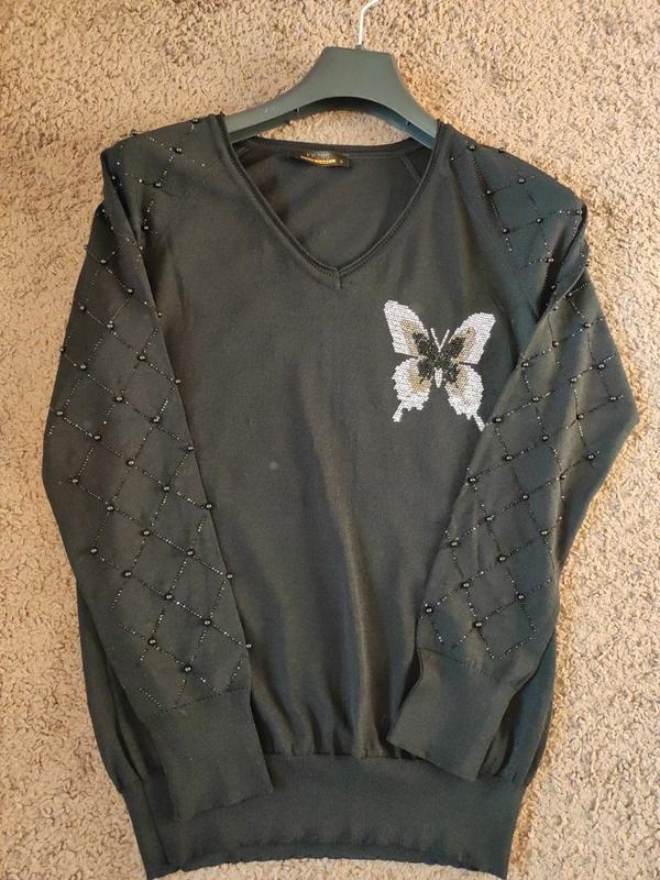 Нарядная тонкая кофта, на груди бабочка из страз, рукав декорирован камнями и бусинами, качество супер, без бирки, размер 44-46
