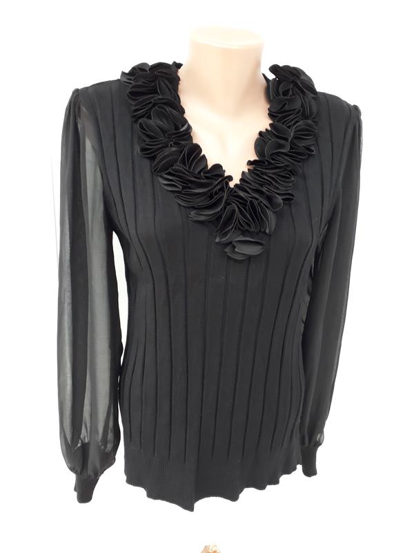 Нарядная комбинированная черная кофта, основа тонкая вязка, рукава шифон, декор на горловине цветы из рейона (искусственный шелк). Стан идеален, как новая. Плечи 41см, пог 48см, пот 46см, поб 46см, длина 60см, рукав от плечевого шва 63см. Замеры в спокойном нерастянутом состоянии. .5.4.