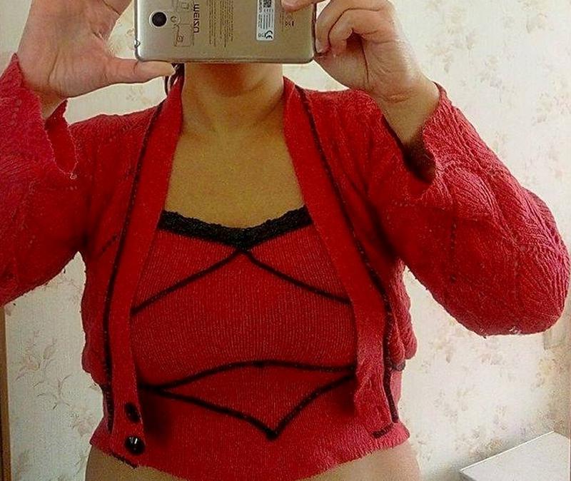 Очень красивый комплект дивного малинового цвета. Двойка - маечка и кофта. Майка - на бретелях из ажурной тесьмы. Кофта - ажурная вязка