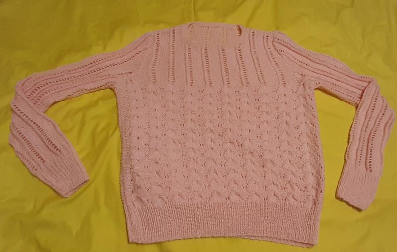 Вязаный ажурный джемпер красивого розового цвета. Длина 58см От плеча до плеча 33см ПОГ 51см ПОТ 47см