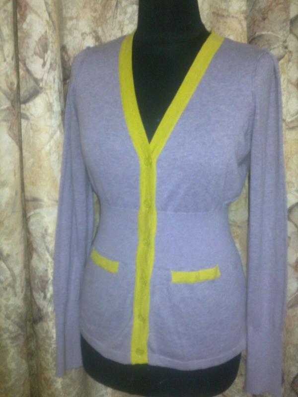 Стильный джемпер-кофта, оригинальной расцветки, светло-сиреневого меланжа с лимонной-желтой отделкой (цвета в реальности приглушенные), имеет приталенный, удлиненный фасон, на пуговках. Карманов нет. Изготовлен бренд.фирмой NEXT, в Китае, из 85%коттона, 9%шерсти и 6%полиамида, приятная. тонкая, вязанная, ткань. Размер 46-44 М, состояние отличное, новое, навесных ярлыков нет, сток. РАЗМЕР: ПОГ.=48см, ПОТ.=34см(тянется до46см), ПОБ.=51см, Длн.издл.=67см, Длн.рукв.=67см(подкатываются на нужную высоту), Шир.плеч=38см. ЛОТЫ КОМБИНИРУЮ!!!