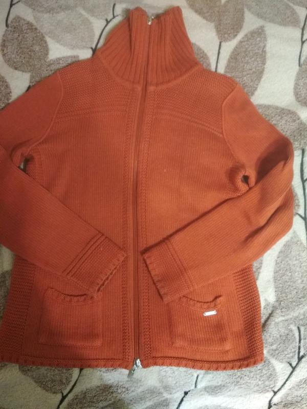 Тёплая, классическая кофта,оранжевого цвета. Состояние хорошее, носилась аккуратно, одна из любимых вещей. Сейчас маловата стала. Состав не знаю, бирки нет. Но приятная к телу. Не кашлатится.