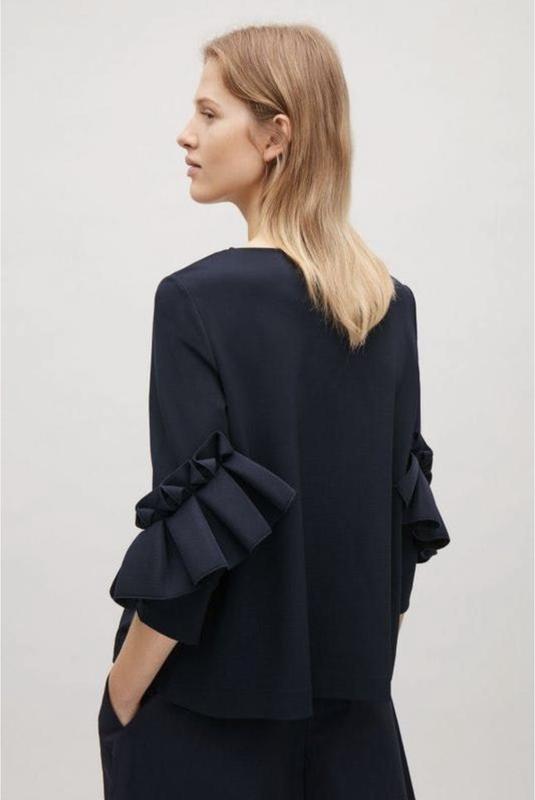 Блуза шведського бренду Cos з незвичайними рукавами не залишиться непоміченою. Колір — насичено-чорний, камера трохи спотворює. Вільна в талії і стегнах, А-подібний силует. В ідеальному стані, сяде на S-ку або маленьку M. У складі віскоза, підкладка котон, приємна до тіла. Рукава тримають форму, тому блуза не мнеться під час носіння або прання.