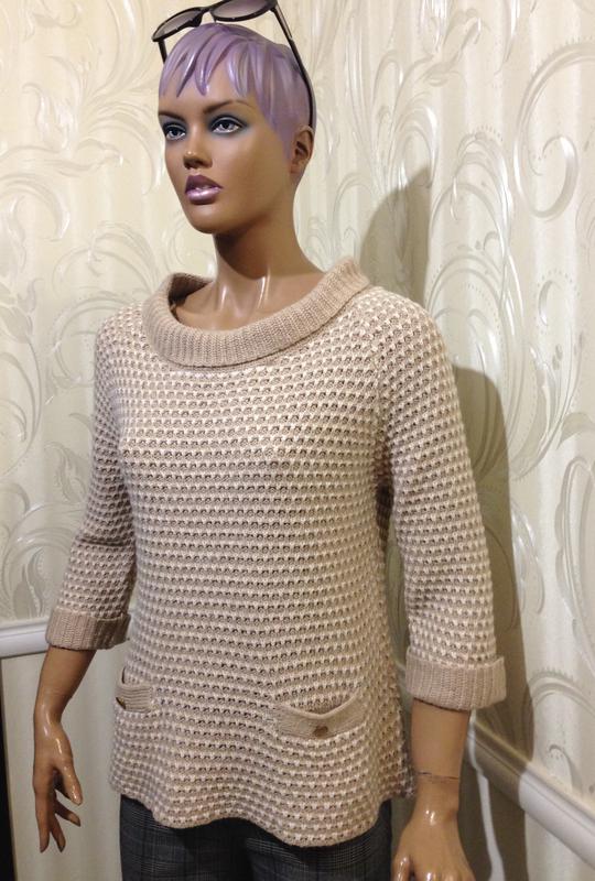 Джемпер фактурной вязки бежевого цвета с белыми вкраплениями, свободного, слегка расклешенного кроя, воротник лодочка с отворотом, впереди два внутренних функциональных кармашка, рукав-реглан длиной 3/4 с манжетом. Бренд MARKS & SPENCER (Британия). Состав: 57% акрил, 24% шерсть, 19% полиамид. Размер10/S-M (см. замеры). Состояние очень хорошее, без дефектов. Замеры: плечи - 38 см., ПОГ - 48 см., ПОниз - 52 см., длина - 61 см., длина рукава: внешняя - 46 см., внутренняя - 26 см. Размер манекена S. Добро пожаловать в мой магазин. Известные бренды, отличное качество - доступные цены.