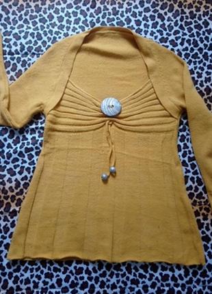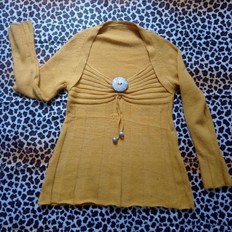 Кофточка теплая 70% шерсти., 30% акрил. Одевалась пару раз. Очень красиво смотрится на красивую грудь. Тянется. Вещь из собственного гардероба. Катышек и протертостей нет. Цвет жолто-горчичный. Выросла с размера. Не секонд.