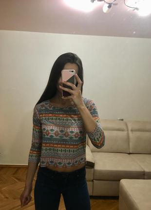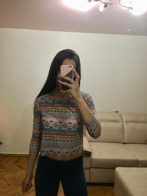 Укороченая легенькая кофточка Atmosphere в узоры Размер ХС-С Длинна от плеча 43 см Рукав – 46 см Состояние новой Одето на рост 165 см, параметры 85-63-95