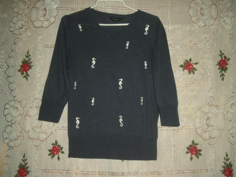 Шикарная кофточка синего цвета,фирменная,натуральная,впереди аппликация из морских коньков,вышитых серебристыми нитями,низ рукавов и низ кофты-широкая манжет-резинка,объем груди-100см.,рукав длиной-42см.присобран сверху,,длина кофты-60см.