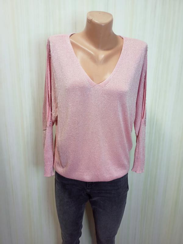 Пуловер розовый Пуловер розовый с люрексом. Модель с V-образной горловиной. Длинный рукав и низ изделия на ребристых манжетах и вырезом . низ изделия на резинке. размер M -L длина 73 см ог 55 см рукав от горловины 58 см без нюансов
