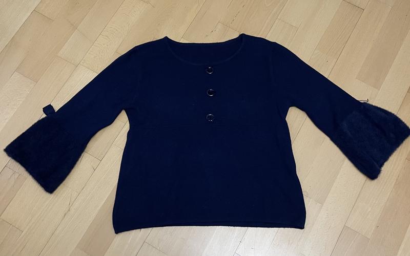 Кофта темно - синего цвета. Плечи 39 см, ПОГ 44 см, длина 51 см. Рукава внизу заканчиваются тканью, имитирующих мех.