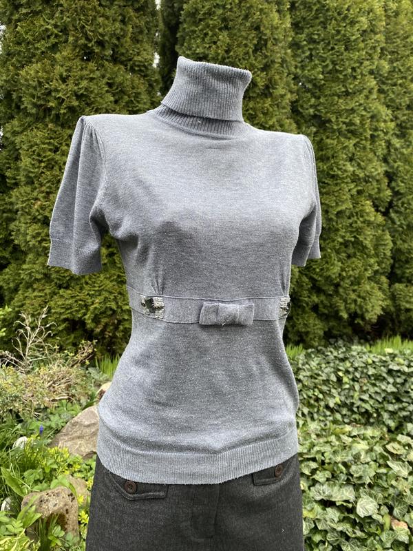 Кофта під шию , з короткими рукавами . Сірого кольору , зпереду оздоблена стіклярусом. Довжина 56 см, рукав 20 см, груди 86 см ( тягнеться добре), плечі 36 см.